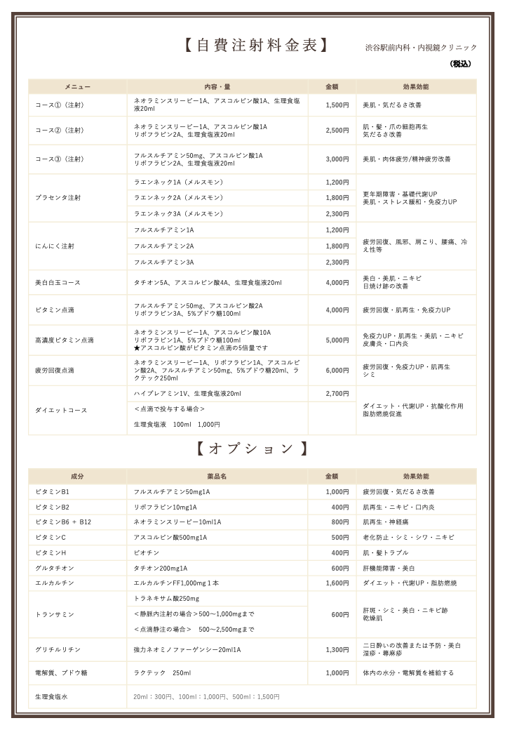 にんにく注射・プラセンタ注射をはじめ、各種自費注射メニューを取り揃えております。ご希望の方はお気軽にお申し出ください。